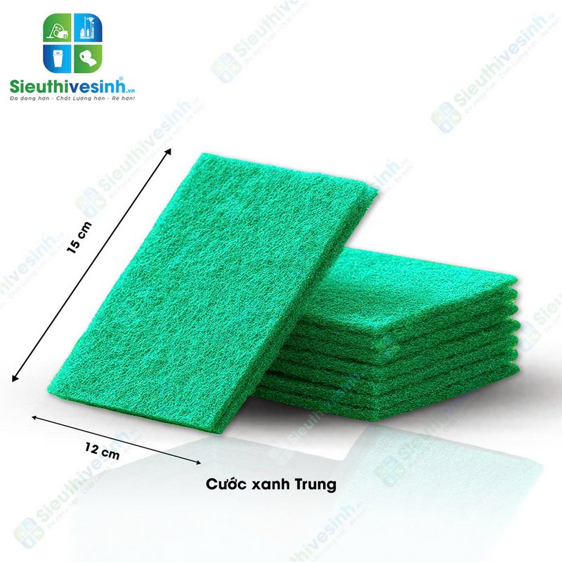 Cước xanh trung 12x15cm là lựa chọn lý tưởng cho công việc chùi rửa hằng ngày nhờ thiết kế nhỏ gọn, dễ cầm nắm và hiệu quả làm sạch vượt trội. Sản phẩm được làm từ sợi tổng hợp bền chắc (polyester hoặc tương tự), có cấu trúc dày đặc nhằm tạo độ ma sát tốt giúp đánh bay các vết bẩn cứng đầu như dầu mỡ, cặn thức ăn hay gỉ sét nhẹ mà không gây trầy xước nghiêm trọng cho bề mặt.