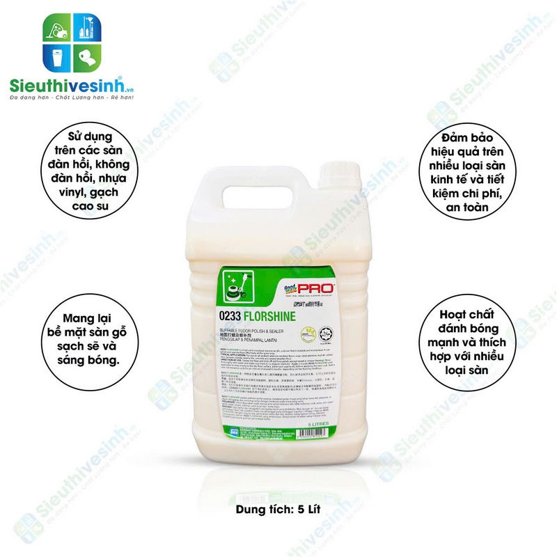 Goodmaid PRO Florshine 0233 – 5L là một sản phẩm được thiết kế đặc biệt để đánh bóng và bảo vệ các loại sàn. Sản phẩm này có nhiều công dụng và mang lại hiệu quả cao trong việc làm sạch cũng như bảo dưỡng sàn như: