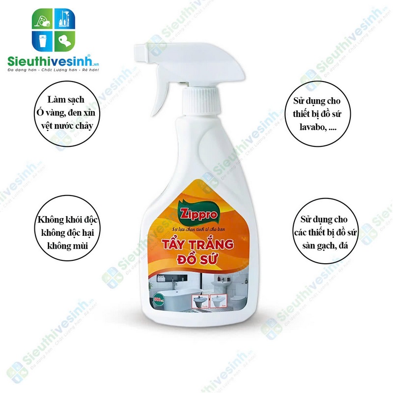 Hóa chất tẩy trắng đồ sứ Zippro 500ml là sản phẩm làm sạch hiệu quả, chuyên dụng cho các bề mặt sứ như bồn cầu, lavabo, bồn tắm, chậu rửa,… Sản phẩm được sản xuất theo công nghệ tiên tiến, với công thức đậm đặc giúp đánh bay các vết ố vàng, cáu cặn, vết rỉ sét và mảng bám lâu ngày mà không gây ăn mòn bề mặt men sứ.
