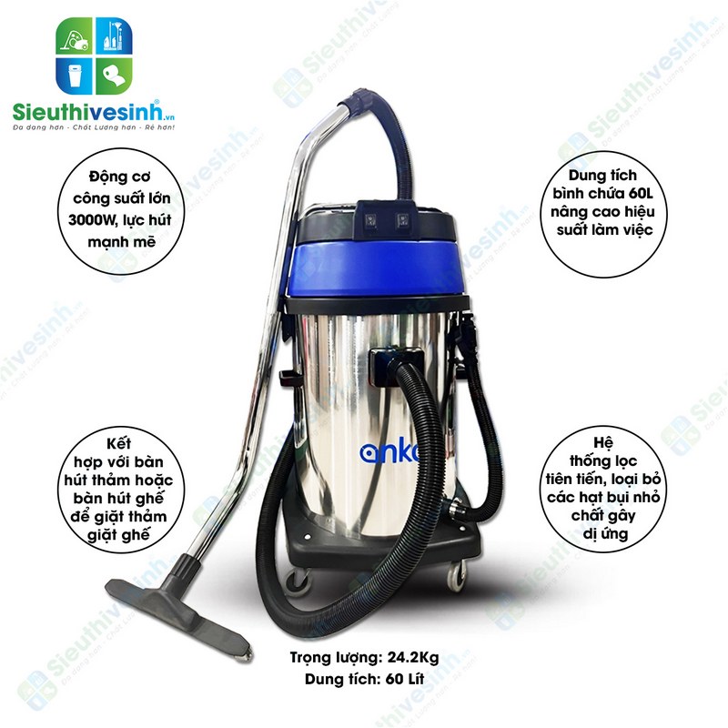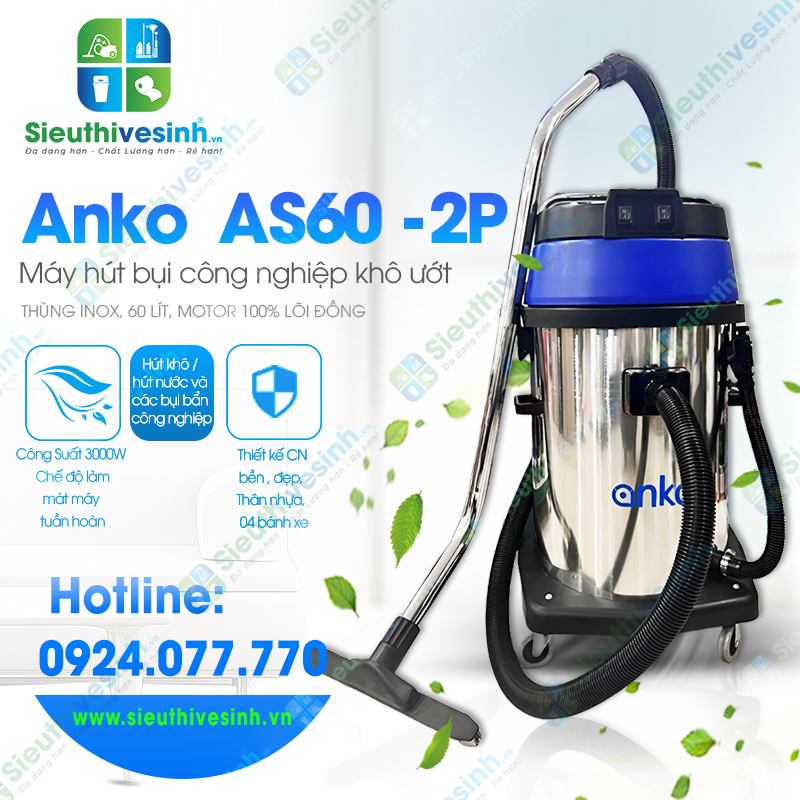 Máy hút bụi công nghiệp khô ướt Anko AS60-2P thùng inox