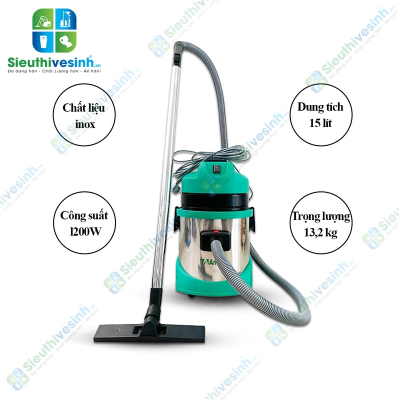 - Công suất 1500W (1.5 kW) cung cấp lực hút mạnh mẽ để thu gom các loại bụi và rác thải công nghiệp.