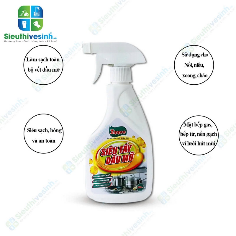 Chai siêu tẩy dầu mỡ Zippro 500ml là sản phẩm chuyên dụng để loại bỏ các vết dầu mỡ cứng đầu bám trên nhiều bề mặt khác nhau trong nhà bếp như bếp ga, bếp từ, máy hút mùi, xoong nồi, chảo, tường gạch ốp và chậu rửa bát.